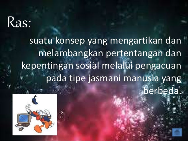 Ras adalah golongan manusia dengan ciri fisik yang sama Ras merupakan pengelompokan besar manusia yang memiliki ciri ciri biologis lahiriah yang sama seperti warna dan bentuk rambut warna kulit bentuk hidung bentuk bibir ukuran tubuh ukuran kepala warna bola mata dan lain sebagainya